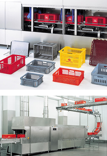 Reusable containers as well as chocolate moulds and plates in the food and confectionery industry must be cleaned thoroughly. Simple manual cleaning does not usually prove sufficient. Cleaning and drying must comply with hygienic standards. Recesses, ribs and scooping points, in particular, make cleaning and drying the moulds and containers difficult.