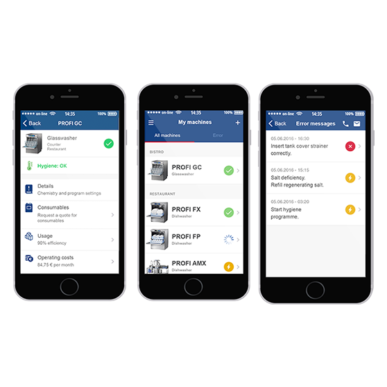 The new HOBART WASHSMART app provides you with a comprehensive overview of the status of your glasswasher free of charge for 5 years. Among other features, the app informs you well in advance of maintenance due dates and indicates the current operating costs and chemical consumption.