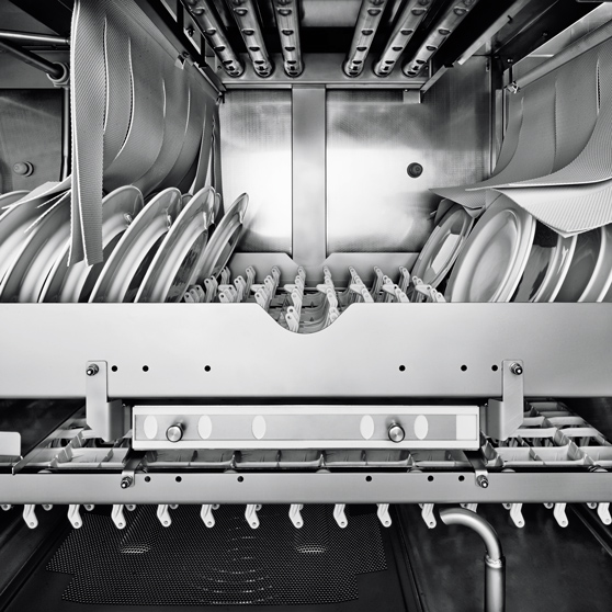 Compared to conventional dishwashing systems, the HOT-TEMP washing cleans the wash ware at approx. 67 °C – instead of 60 °C. This leads to a significant increase in the efficiency of the chemicals and the wash ware gets clean faster.