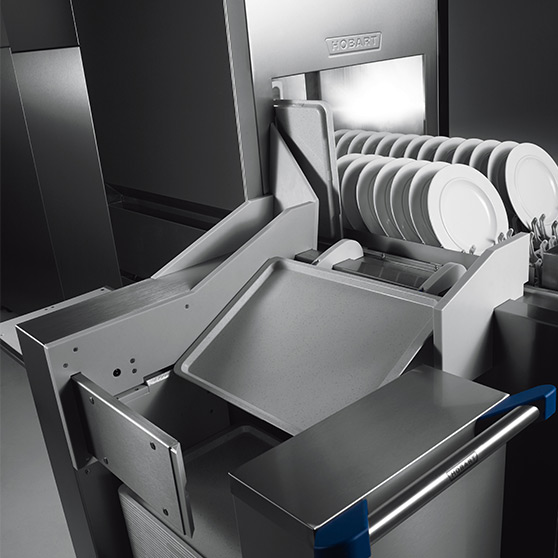 Flight-type dishwashers are intended for fast cleaning of large quantities of wash ware items. For these dishwashers, it is particularly important that the two factors, footprint and efficiency are well balanced. HOBART has a solution for this challenge that also meets all the specific requirements made in flight-type dishwashers in everyday practical use: the unique, innovative twinLINE.
