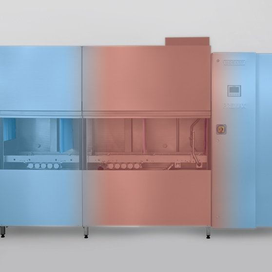 In this system, the hot machine zones are enclosed by the cooler zones such as pre-wash and drying. The resulting temperature curtain ensures that air exchange can only take place within the machine. The PREMAX is characterised by a special temperature profile and exploits this principle in an optimum manner.